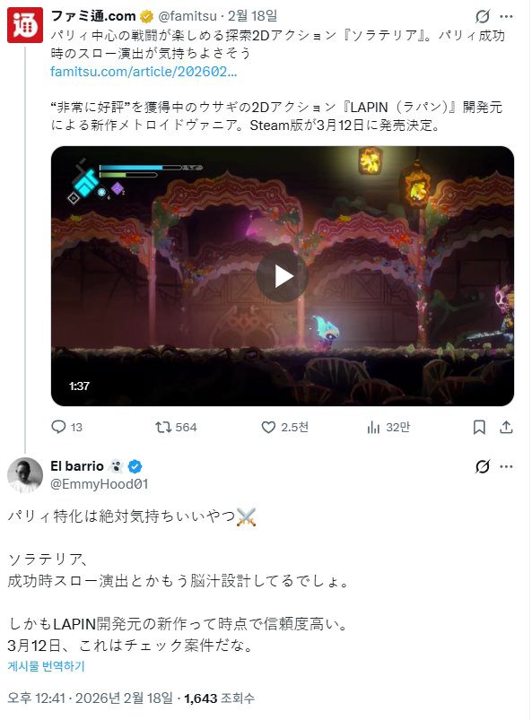 ▲ 편집자 주: 일본의 게임지 패미통에, 국내 인디 개발사 스튜디오 두달이 개발 중인 <솔라테리아> 출시일(2026년 3월 12일)이 공개된 때의 사진입니다.