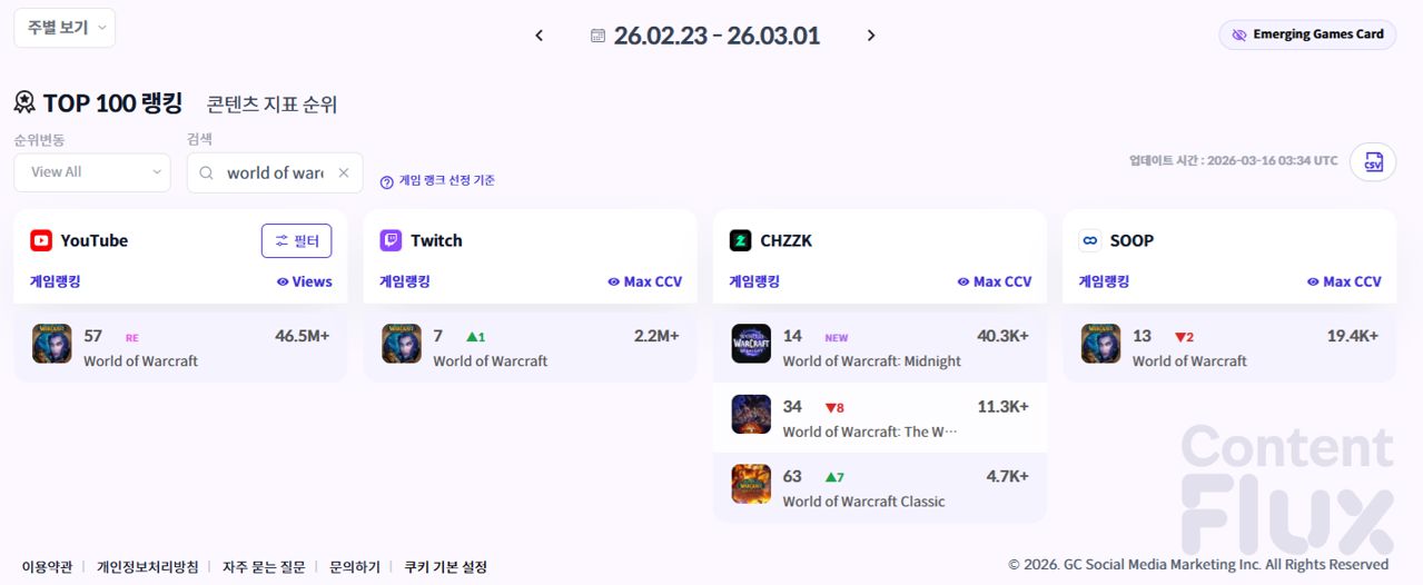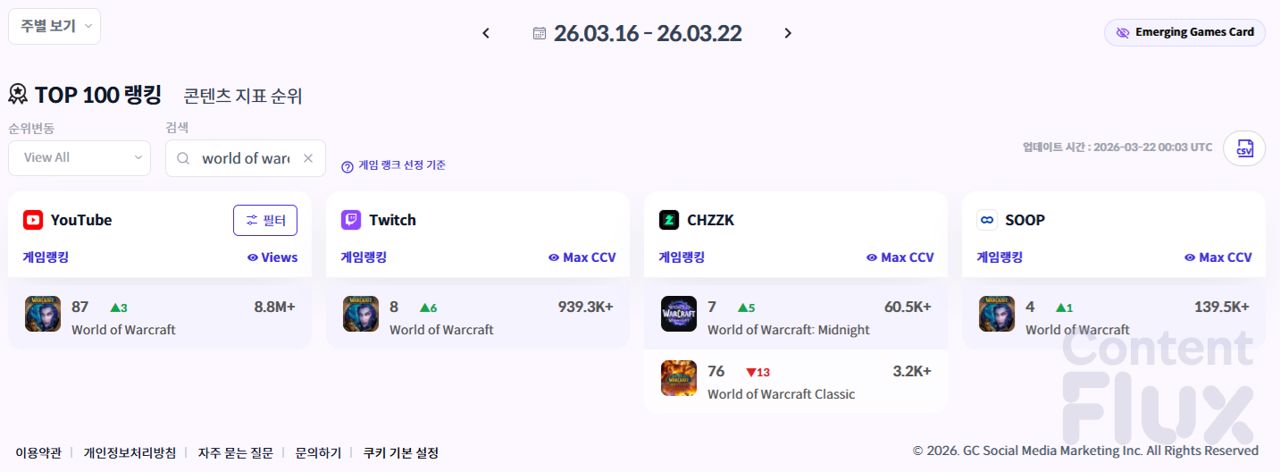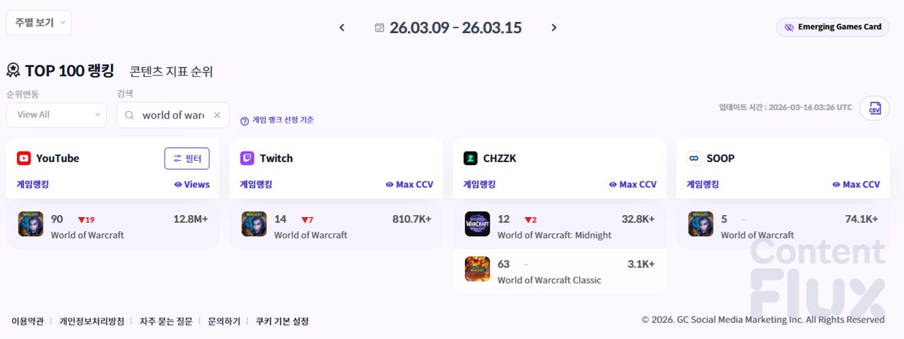 ▶ 3월 셋째 주 누적 조회수 및 동시 시청자 수 기준 ContentFlux Top 100 <월드 오브 워크래프트> 순위.