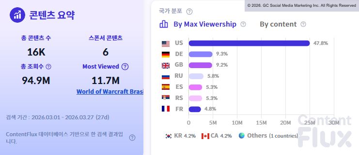 글로벌 시청 분포는 전통적인 강세 지역인 북미와 유럽 시장에 집중되어 있습니다. 유튜브 조회수 기준으로는 미국이 47.8%로 압도적인 비중을 차지했으며, 독일(9.3%), 영국(9.2%), 러시아(5.8%)가 뒤를 이었습니다. 한국은 4.2%의 비중을 기록했습니다.