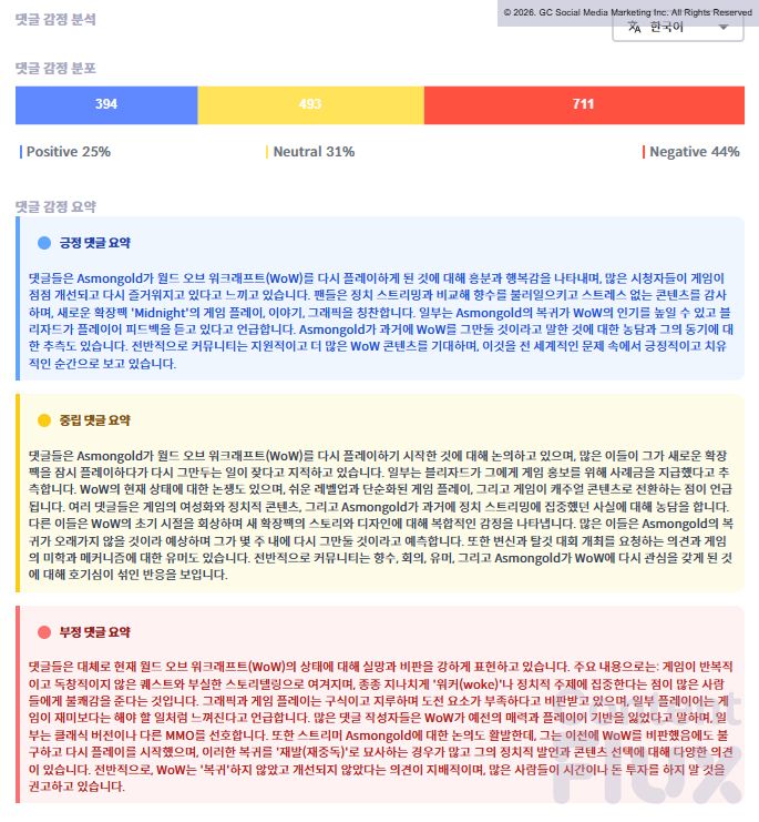해당 영상의 시청자 반응은 부정 44%로 집계되었습니다. 한편, 이는 게임 자체에 대한 비판보다는 스트리머의 개인적 행보와 <월드 오브 워크래프트> 복귀를 향한 시청자들의 엇갈린 여론이 반영된 결과로 분석됩니다.