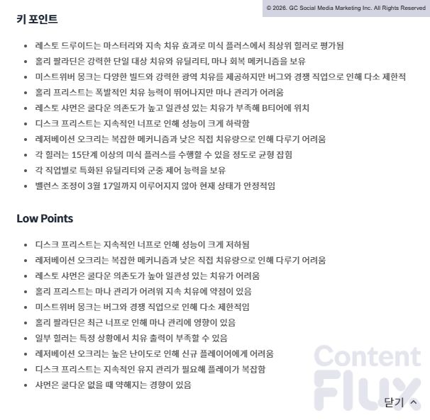 그는 각 직업의 메커니즘 변화와 던전 적응력을 바탕으로 티어를 분류했으며, 회복 드루이드와 신성 성기사를 최상위 티어로 평가했습니다. 반면 수양 사제는 지속적인 너프로 인한 성능 하락을, 회복 주술사는 높은 쿨다운 의존도로 인한 운영의 어려움을 지적하며 메타 변화를 예고했습니다.
