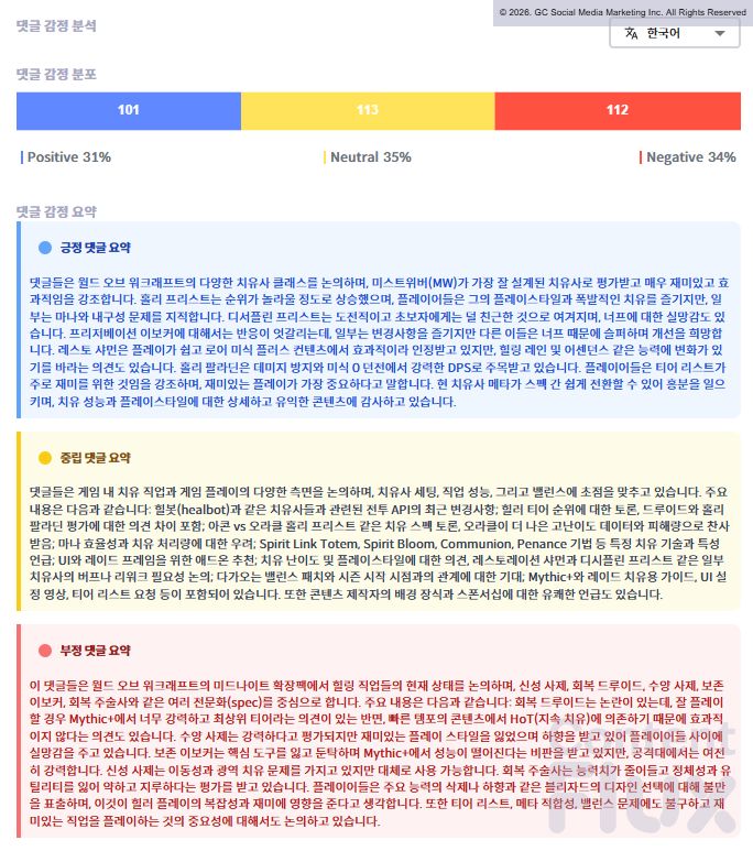 해당 채널의 시청자들은 긍정 31%, 중립 35%, 부정 34%로 비교적 균등한 반응 분포를 보였습니다. 전문적인 티어리스트 정보에 대해서는 높은 만족도를 보였으나, 주요 능력 삭제 등 블리자드의 직업 밸런싱 방향에 대해서는 시청자들 사이에서도 의견이 팽팽하게 갈리는 모습이 확인되었습니다.