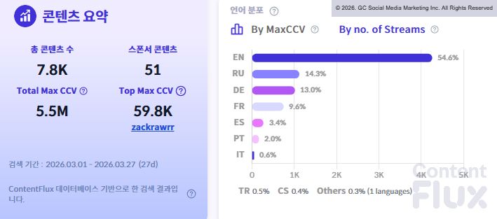 트위치 플랫폼의 언어별 비중은 영어권의 점유율이 절대적입니다. 동시 시청자 수 기준 영어가 65.1%로 과반을 훌쩍 넘겼으며, 프랑스어(11.4%), 독일어(10.9%), 러시아어(8.7%) 순으로 집계되었습니다.