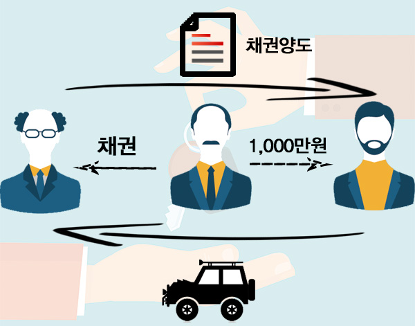 간단히 예를 들어 보면, A, B, C 세 사람이 있고, A가 B에게 지금 당장 1,000만원을 받을 수 있는 권리, 즉 채권이 있다고 가정해 봅시다. 그런데 A가 C로부터 1,000만원에 차를 사기로 하고 매매계약을 체결한다면, A는 C에게 1,000만원을 현금으로 주고 차를 살 수도 있지만, 그 대신 B에게 ‘내가 당신으로부터 1,000만원을 받을 수 있는 권리를 이제 C에게 양도하겠으니 1,000만원을 C에게 주십시오’라고 얘기할 수도 있을 것입니다.