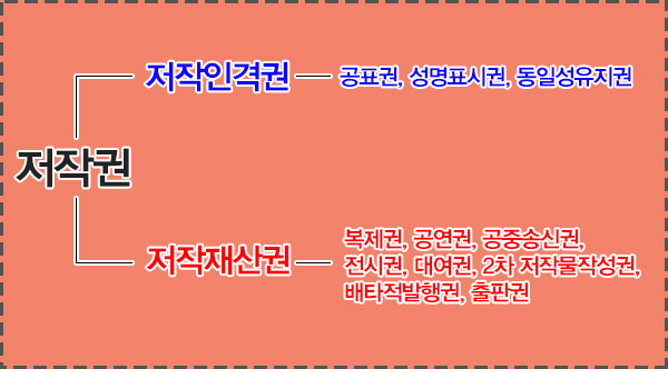 저작권은 크게는 저작인격권과 저작재산권으로 나뉩니다. 저작인격권은 공표권 / 성명표시권 / 동일성유지권 등으로 나뉘는 한편, 저작재산권은 복제권 / 공연권 / 공중송신권 / 전시권 / 배포권 / 대여권 / 2차적저작물작성권 / 배타적발행권 / 출판권 등으로 나뉘어집니다.