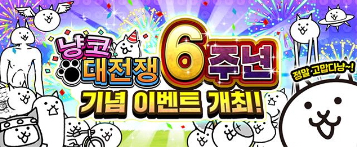 한편, 포노스는 <냥코 대전쟁> 6주년을 기념하여 <냥코 대전쟁> 한국판 공식 페이스북 페이지에서 캠페인을 개최한다. 틀린 그림이 몇 개인지 정답을 맞춘 유저들 중, 추첨으로 고양이 통조림 6년치 분을 선물할 예정이다. 또한 영상의 좋아요, 공유, 재생수 목표를 달성한 기념으로 유저 전원에게 레어 티켓 1장을 선물할 예정이다.