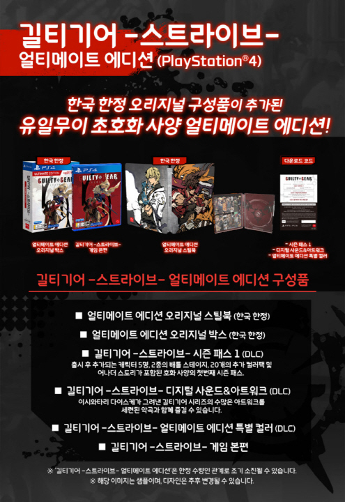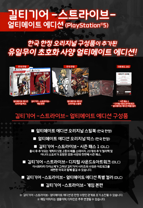 <길티기어 -스트라이브-> 한국어 패키지판의 얼티메이트 에디션 구성품에는 게임 본편과 더불어, 얼티메이트 에디션 오리지널 스틸북과 오리지널 박스가 한국 한정 오리지널 구성품으로 포함되어 있는 것이 특징이다.
