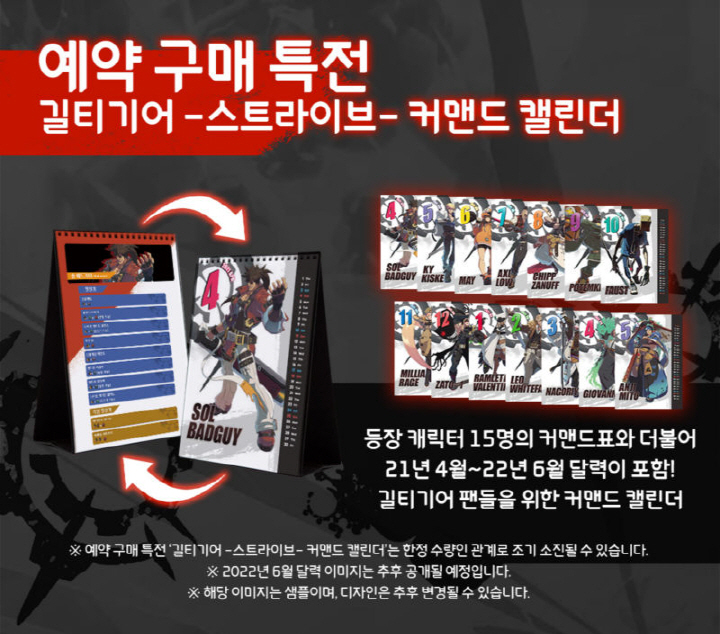 <길티기어 -스트라이브-> 한국어 패키지판의 스탠다드 에디션 및 얼티메이트 에디션을 예약 구매하면, 공통 예약 특전으로 플레이어블 캐릭터의 커맨드표가 달력과 함께 수록된 ‘<길티기어 -스트라이브-> 커맨드 캘린더’가 증정된다.