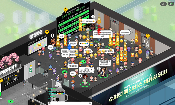 이번 채용 설명회에는 700여 명의 참가자를 비롯해 슈퍼캣, ZEP, 슈퍼캣RPG 채용을 담당하는 인사 담당자가 모두 참여해 자리를 빛냈으며, 100회 이상의 실제 채용 상담이 진행됐다. 오프라인이 아닌 자체 제작 메타버스 플랫폼 ZEP에서 개최해 그 의미를 더하고 있다.