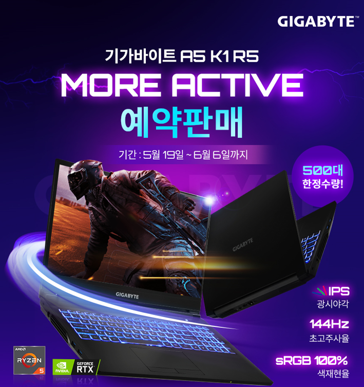이번에 출시하는 15.6형의 A5 K1 R5는 기가바이트의 가성비 게이밍 노트북으로 라이젠 R5-5600H와 엔비디아 지포스 RTX3060그래픽카드가 탑재되었으며 5mm 얇은 베젤로 광활한 디스플레이 IPS 패널을 탑재하여 상하좌우 어느 각도에서 선명하고 동일한 색감을 느낄 수 있다.