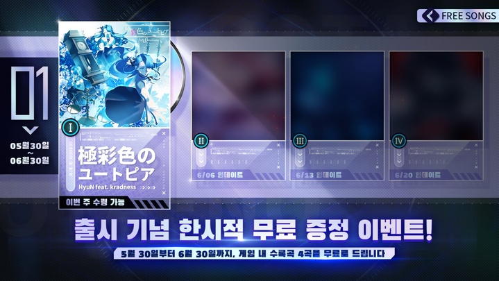 출시 기념으로 게임 속 플레이 가능한 곡을 무료로 받을 수 있는 이벤트도 진행한다, 오늘부터 한달 간 로그인을 통해 매주마다 1곡, 총 4곡을 무료로 수령할 수 있다.