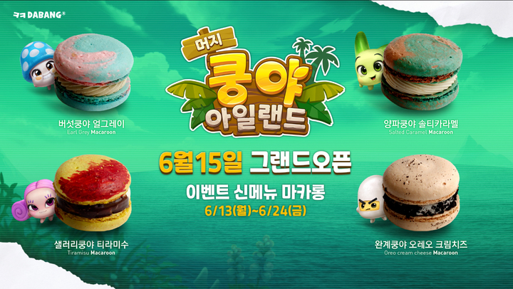 넷마블 자체 IP '쿵야'를 모티브로 한 이번 메뉴는 '용과쿵야 코코넛 에이드', '사과쿵야 리치 에이드' 음료수 2종과 마카롱 4종(버섯쿵야 얼그레이/양파쿵야 솔티카라멜/샐러리쿵야 티라미수/완계쿵야 오레오 크림치즈)이다.