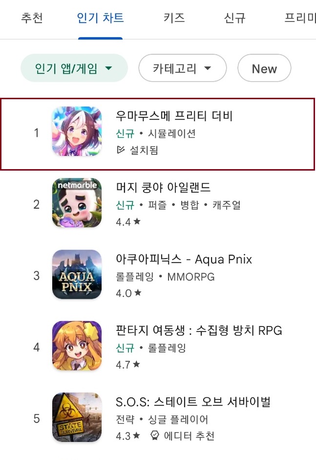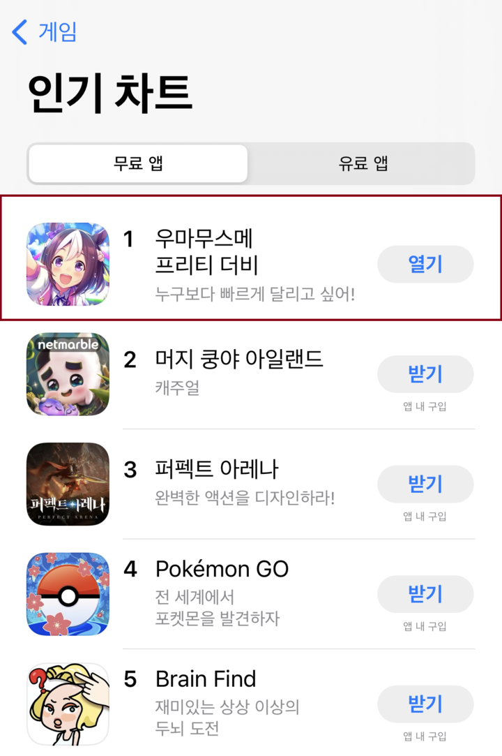 <우마무스메>는 지난 4월 26일 사전 예약을 시작해 10일 만에 사전 예약자 수 100만 명을 돌파하는 등 출시 전부터 이용자들의 관심을 받아왔다. 이러한 인기가 정식 출시까지 그대로 이어진 결과, 출시 직후 구글 플레이 스토어 및 애플 앱스토어 인기 순위 1위를 동시에 달성했다.