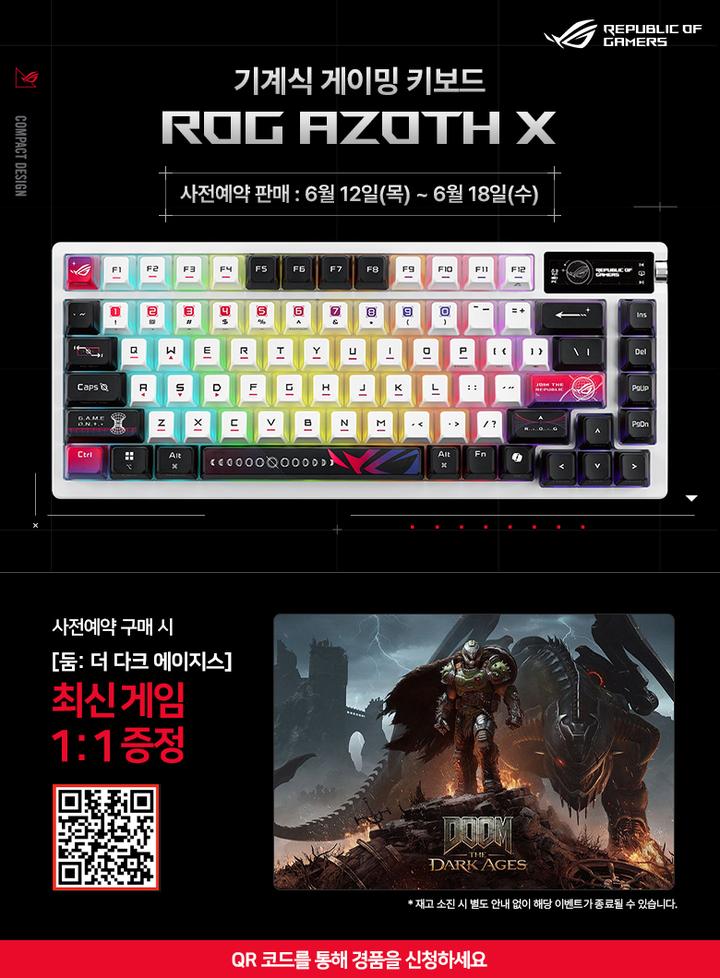 한편, ROG AZOTH X를 구매한 고객은 최신 FPS 게임인 <둠: 더 다크 에이지스>를 증정하는 이벤트에 참여할 수 있어, 최고의 키보드에 걸맞은 최고의 혜택을 즐길 수 있을 전망이다.