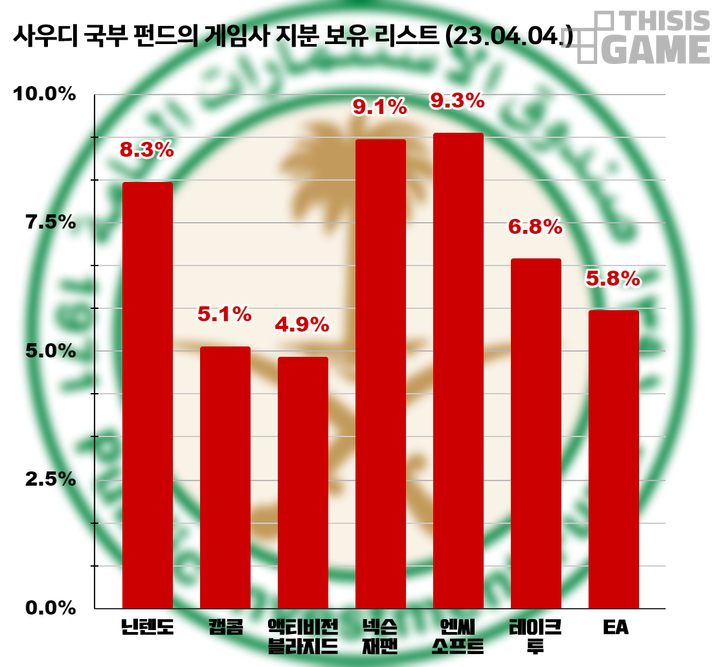 닌텐도의 보유 지분을 8.3%까지 확대했고, 캡콤 지분은 5.1% 액티비전 블리자드 지분은 4.9%를 보유하고 있습니다. 지난 2월 미국 SEC에 보고된 서류에 따르면, PIF는 현재 테이크투의 지분은 6.8%, EA의 지분은 5.8% 가지고 있습니다.